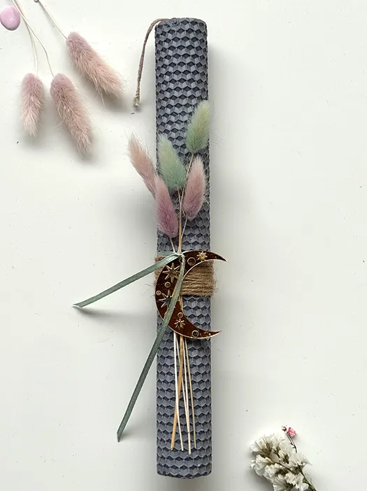 Χειροποίητη λαμπάδα κηρήθρας από μελισσοκέρι και σύμβολο plexiglass φεγγάρι.