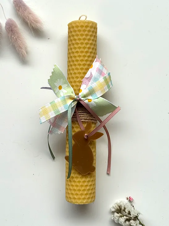 Χειροποίητη λαμπάδα κηρήθρας από μελισσοκέρι και plexiglass σύμβολο λαγός.