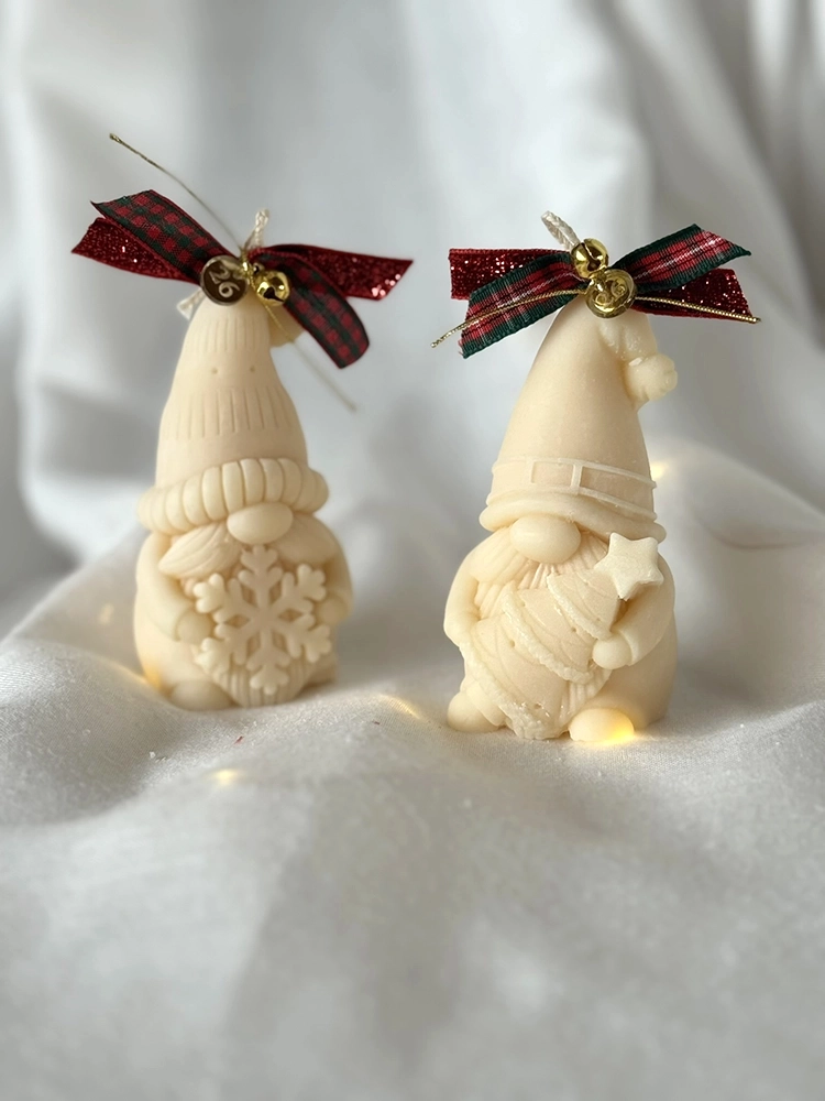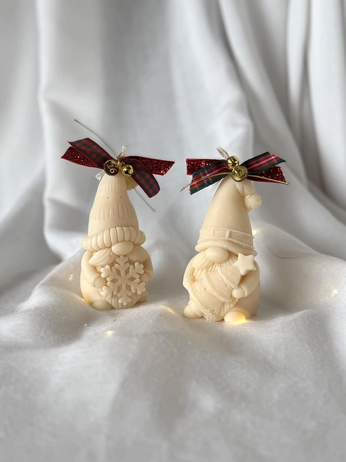 Το σετ περιλαμβάνει δύο χειροποίητα γούρια σε σχήμα νάνων από 100% φυτικό κερί ελαιοκράμβης.