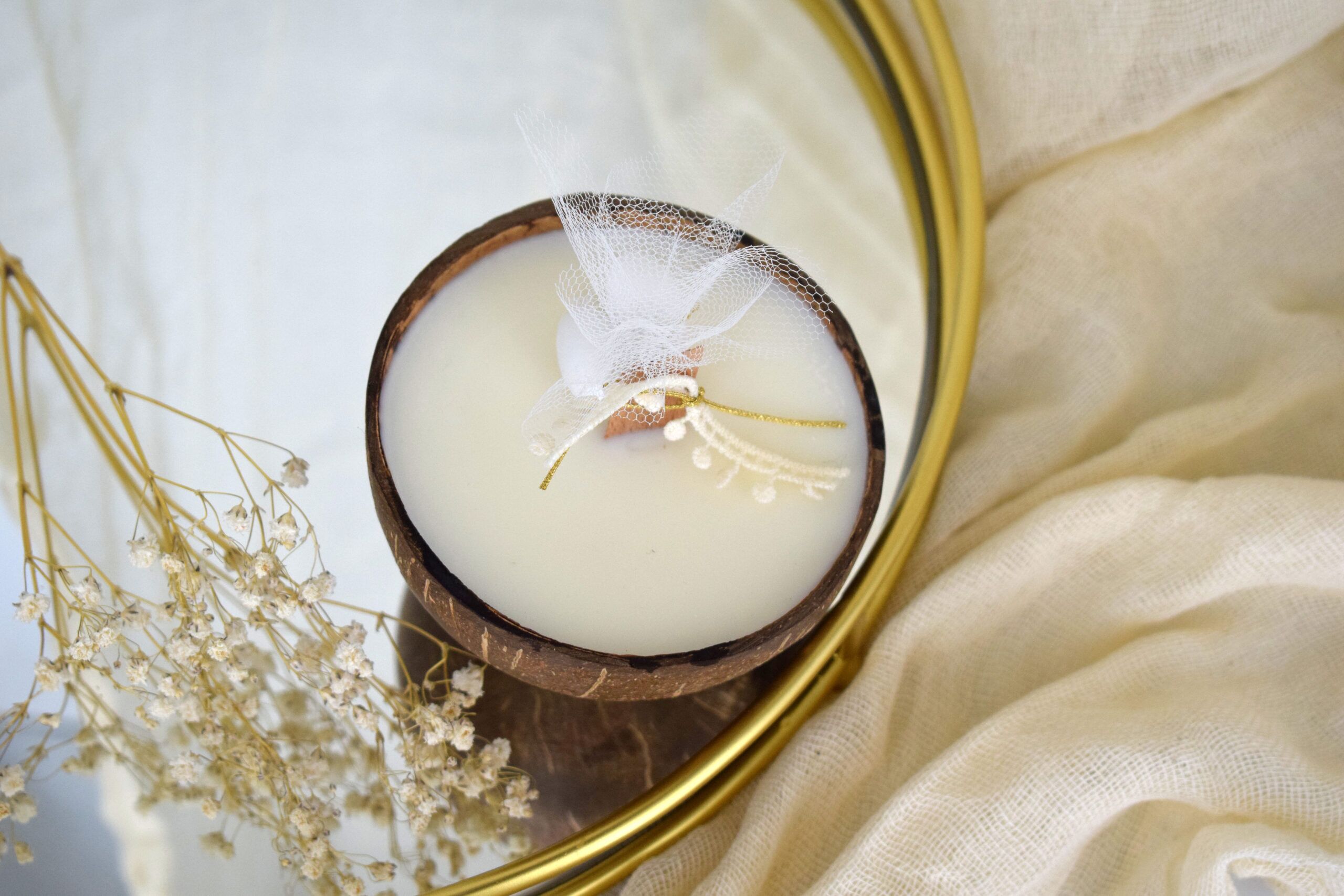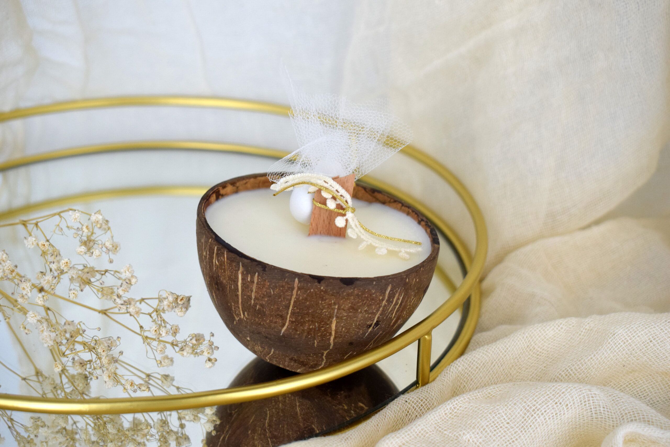 Ξεχωριστή επιλογή για μπομπονιέρα, αρωματικό φυτικό κερί σόγιας με ξύλινο φυτίλι σε δοχείο καρύδας , με δέσιμο από κορδέλες , label της επιλογής σας και κουφέτα!