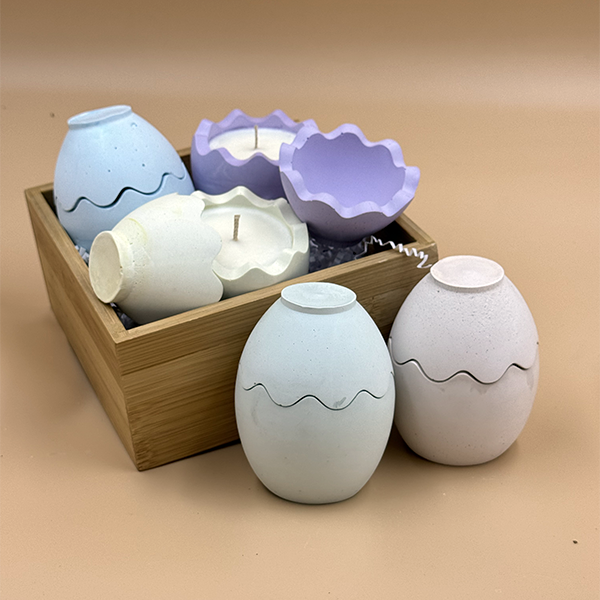 Χειροποίητο δοχείο σε σχήμα αυγού από ακρυλική ρητίνη. Το υλικό από το οποίο φτιάχνεται είναι οικολογικό, μη τοξικό με βάση το νερό. Είναι ανθεκτικό στη θερμότητα και με λεία επιφάνεια και επαναχρησιμοποιούμενο.