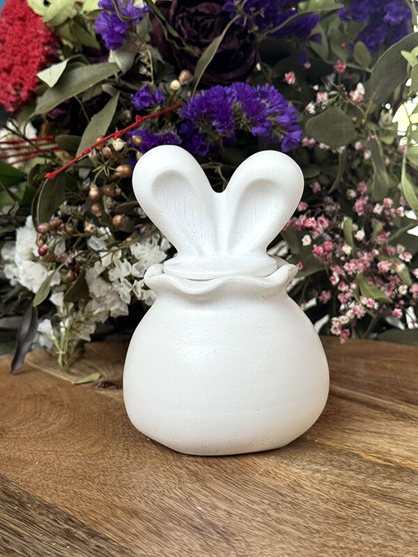 Προσθέστε μια νότα minimal κομψότητας και πασχαλινής θαλπωρής στον χώρο σας με το χειροποίητο διακοσμητικό βαζάκι “Bunny”. Φτιαγμένο από υψηλής ποιότητας μείγμα πορσελάνης. Aυτό το μοναδικό δοχείο συνδυάζει την τέχνη της κεραμικής με την πολυτέλεια ενός αρωματικού κεριού σόγιας
