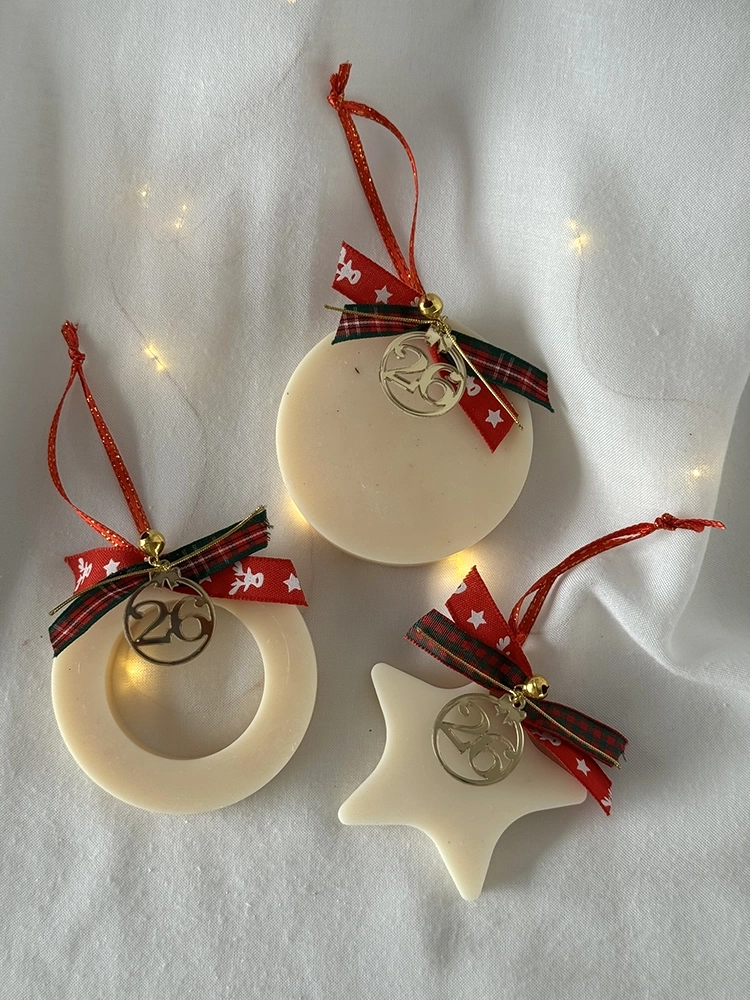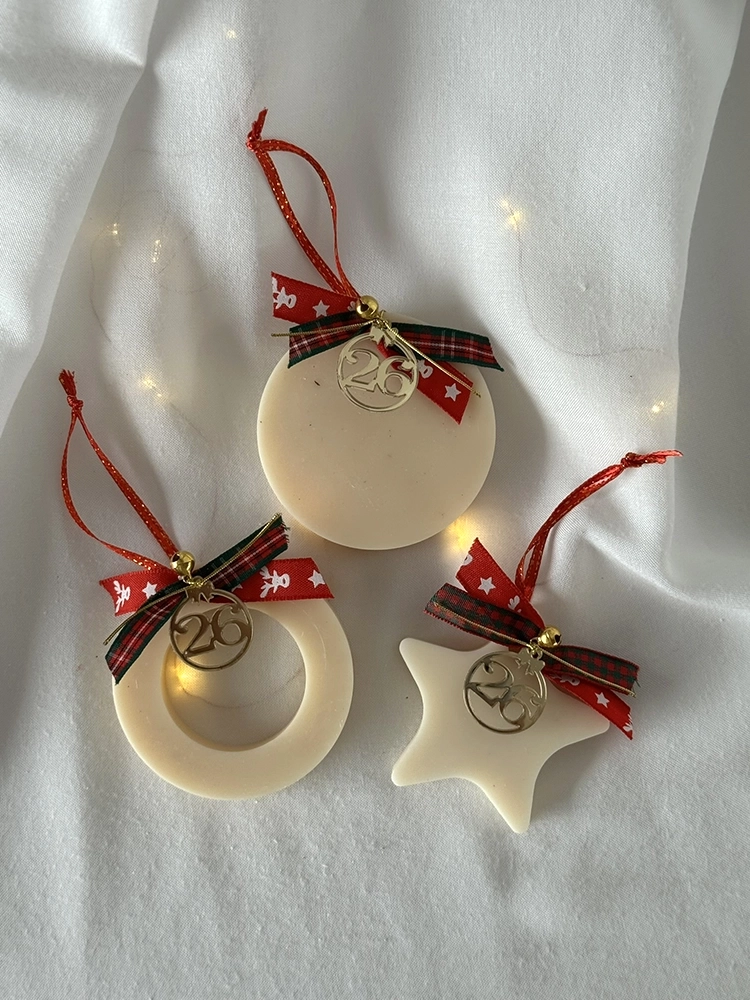 Set από τρία χειροποίητα κρεμαστά στολίδια – γούρια σε διάφορα σχήματα από 100% φυτικό κερί ελαιοκράμβης.
