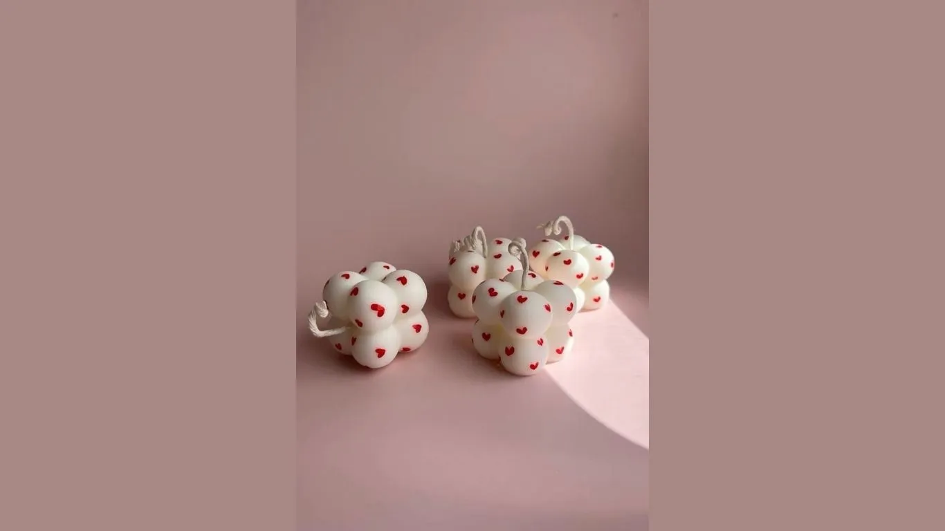 Χειροποίητο κερί σόγιας σε σχήμα bubble με ζωγραφισμένες καρδιές στο χέρι.